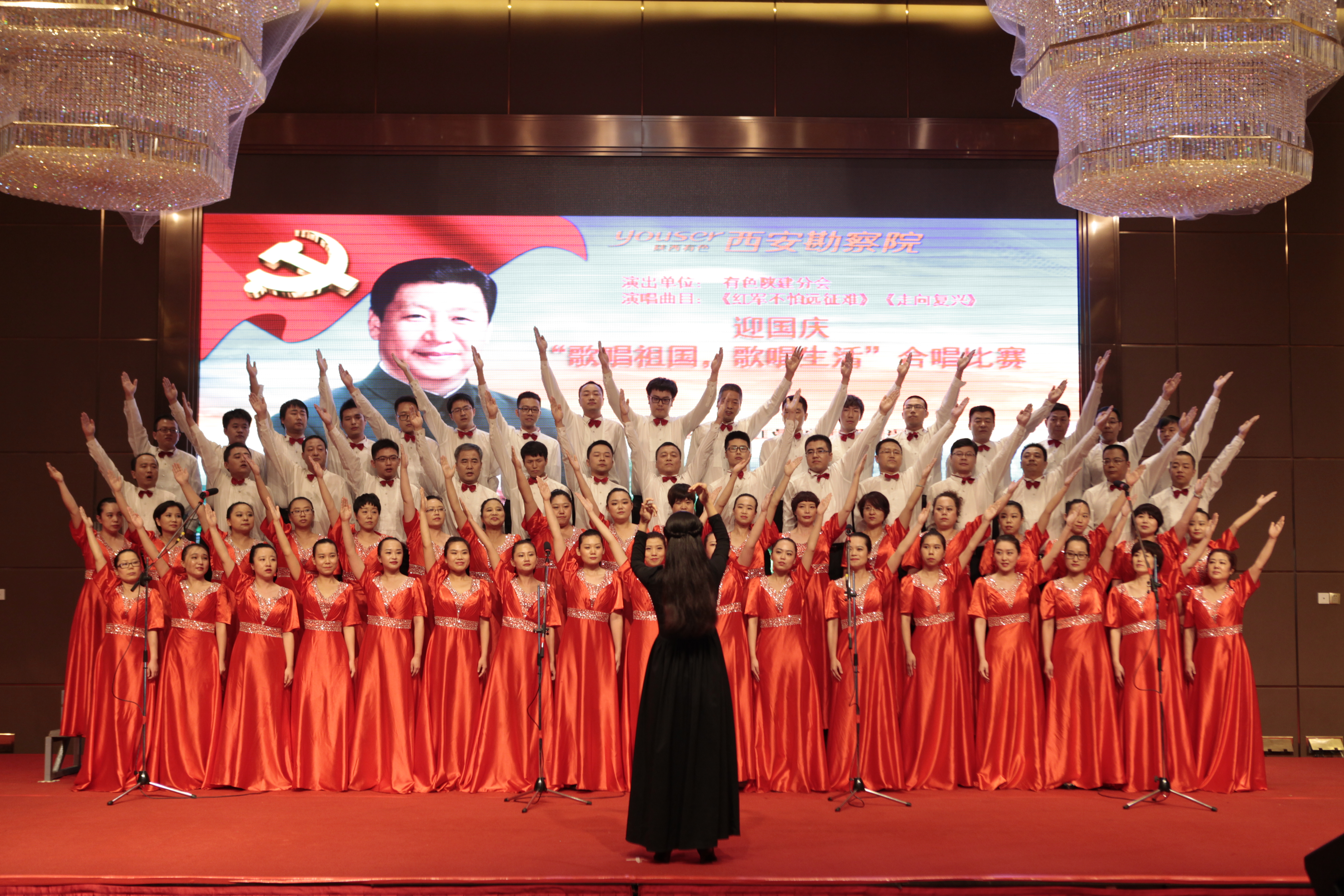 在曲江國(guó)際飯店的永寧大廳里,西勘院領(lǐng)導(dǎo)與500余名職工一同觀看了這次比賽。每個(gè)隊(duì)伍都準(zhǔn)備充足,拿出最佳水平,向祖國(guó)抗戰(zhàn)勝利七十周年獻(xiàn)禮。我公司選擇了《紅軍不怕遠(yuǎn)征難》和《走向復(fù)興》兩首歌曲,組織了有公司領(lǐng)導(dǎo)、職能部門(mén)負(fù)責(zé)人和員工60多人參加的合唱隊(duì),經(jīng)過(guò)一個(gè)多月的用心準(zhǔn)備,大家克服了工作和排練時(shí)間上的沖突,聽(tīng)從排練老師的指揮,每一次都有進(jìn)步和收獲,最終贏得了比賽的勝利。