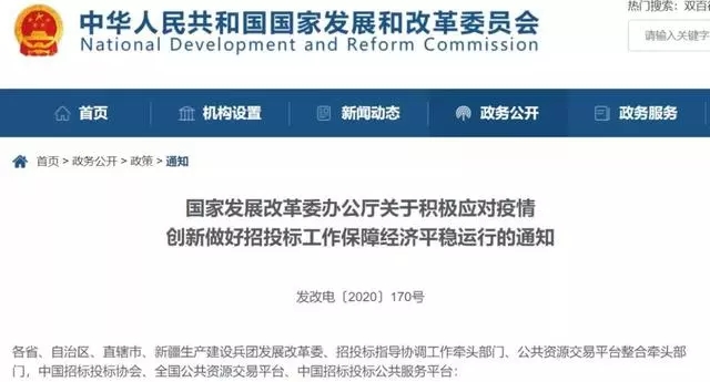 2月8日,國家發(fā)改委辦公廳發(fā)布《關于積極應對疫情創(chuàng)新做好招投標工作保障經(jīng)濟平穩(wěn)運行的通知》,對有序開展招投標等公共資源交易活動、保障經(jīng)濟平穩(wěn)運行提出13條要求。